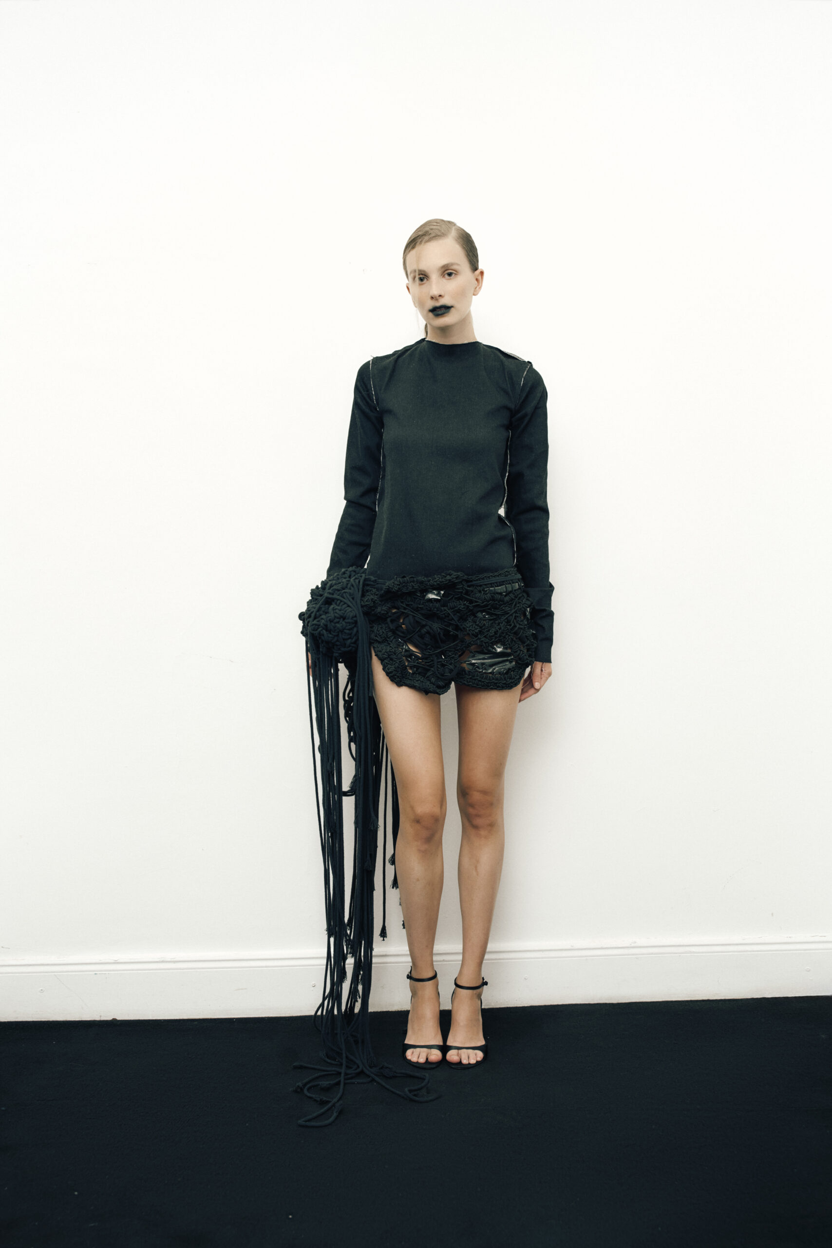 Sistema corsetero que puede usarse al frente, con ojales en plata y cordón elástico que permite ajustar la prenda al entalle deseado. Mangas y ruedo al corte que acompañan la forma del cuerpo.
