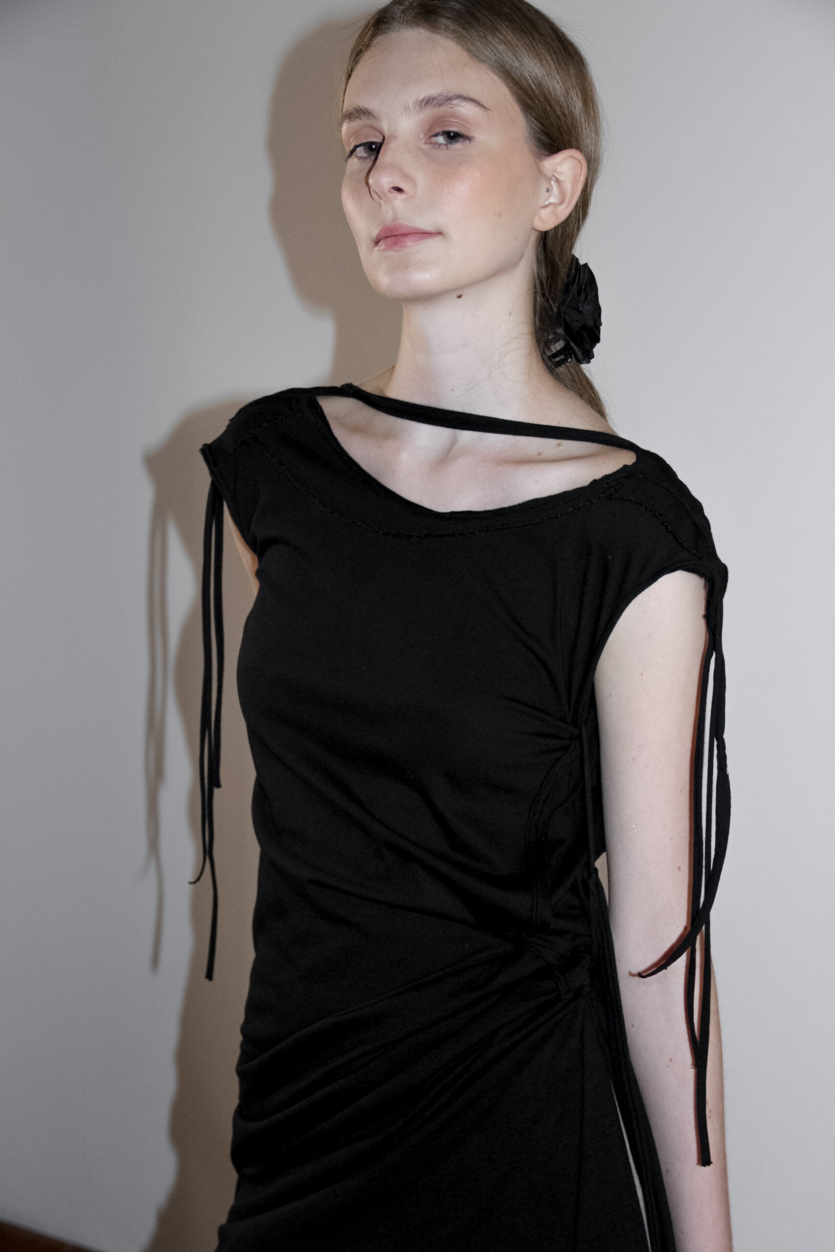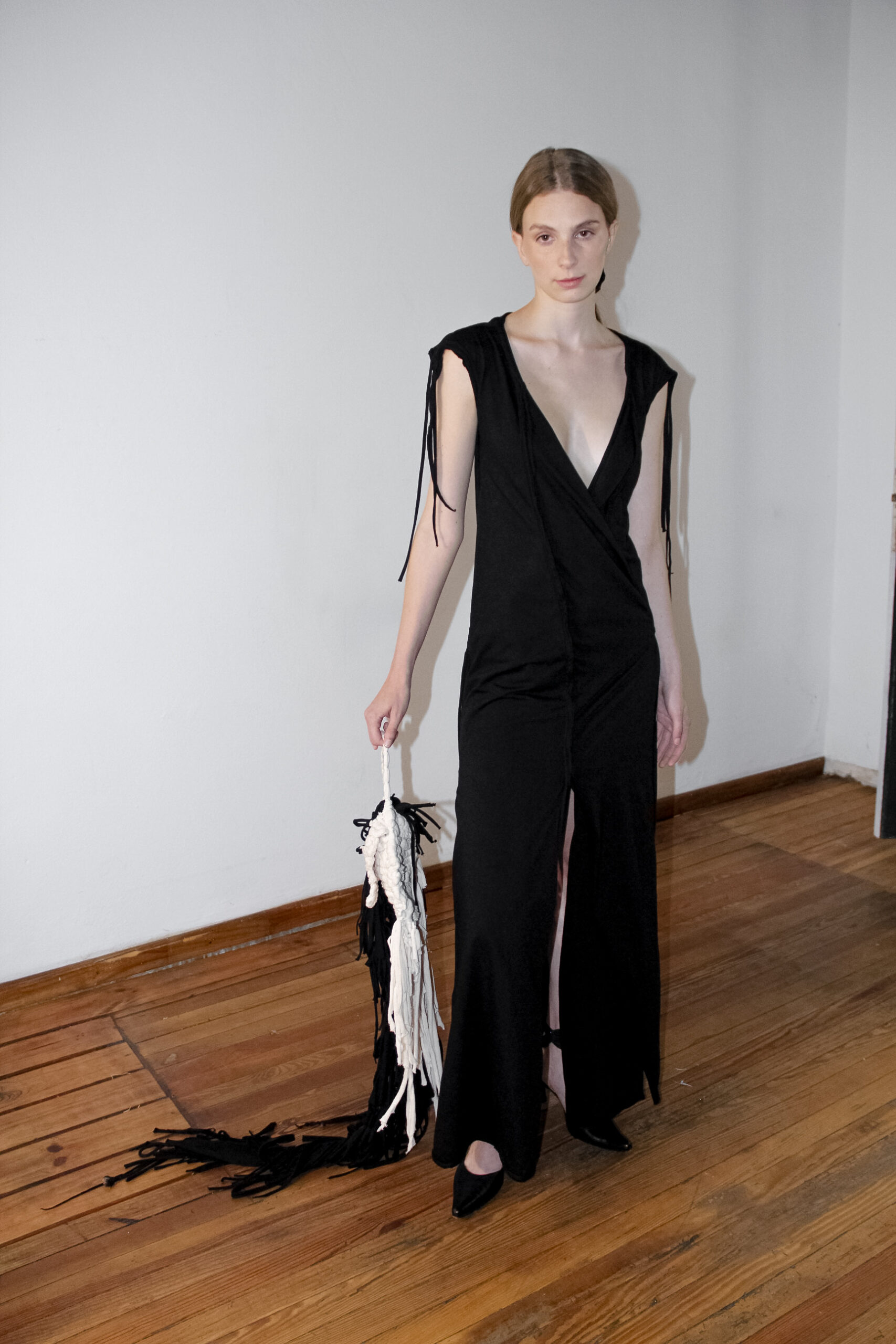 Ajuste mediante lazos. Ruedo irregular. Bordes delineados con costuras y lazos. Texturización manual y calados. Costuras expuestas.