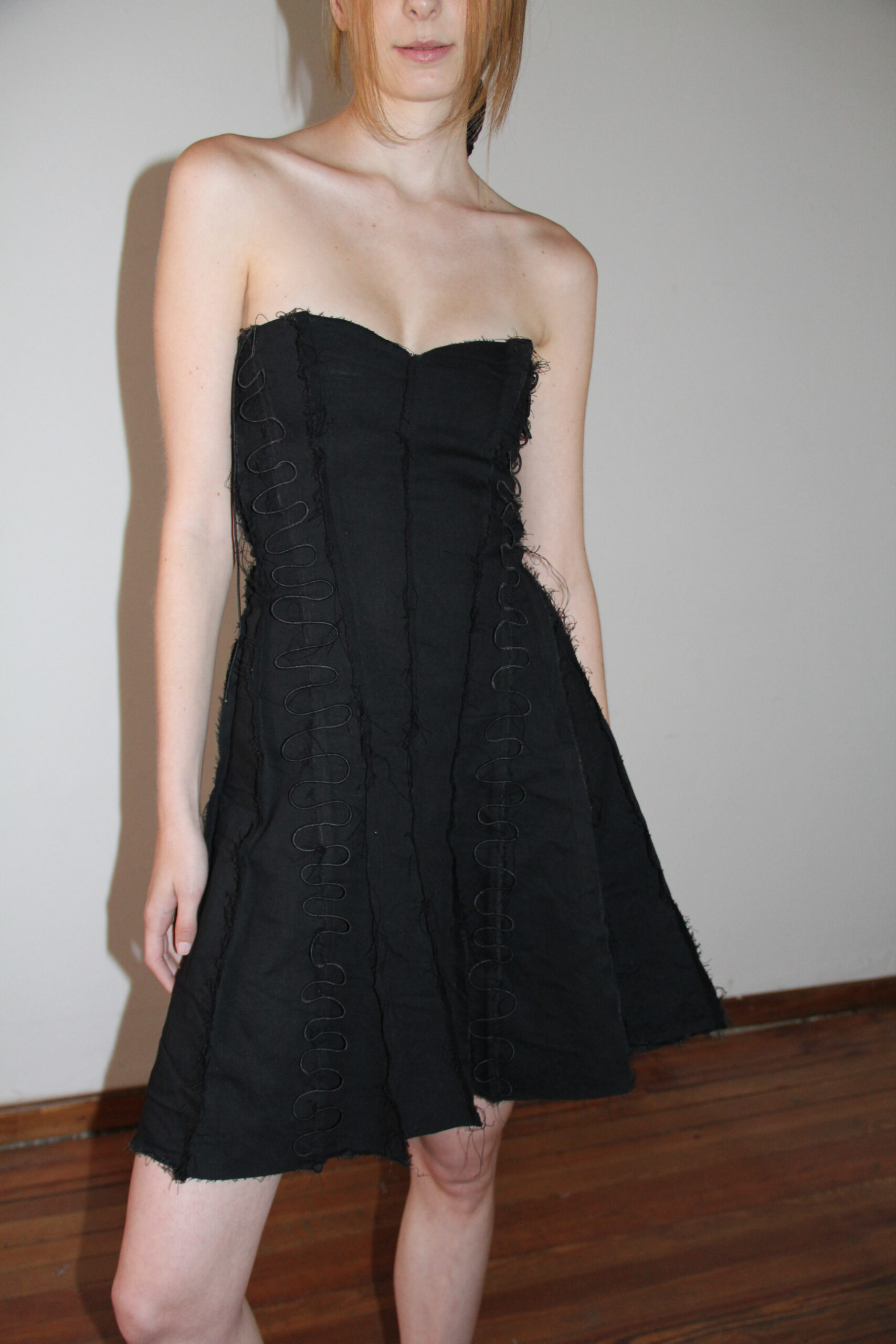 Estructura de corset con evasé en la falda. Ocho líneas con cordones elásticos permiten regular el ajuste. Bordes al corte y escote corazón.